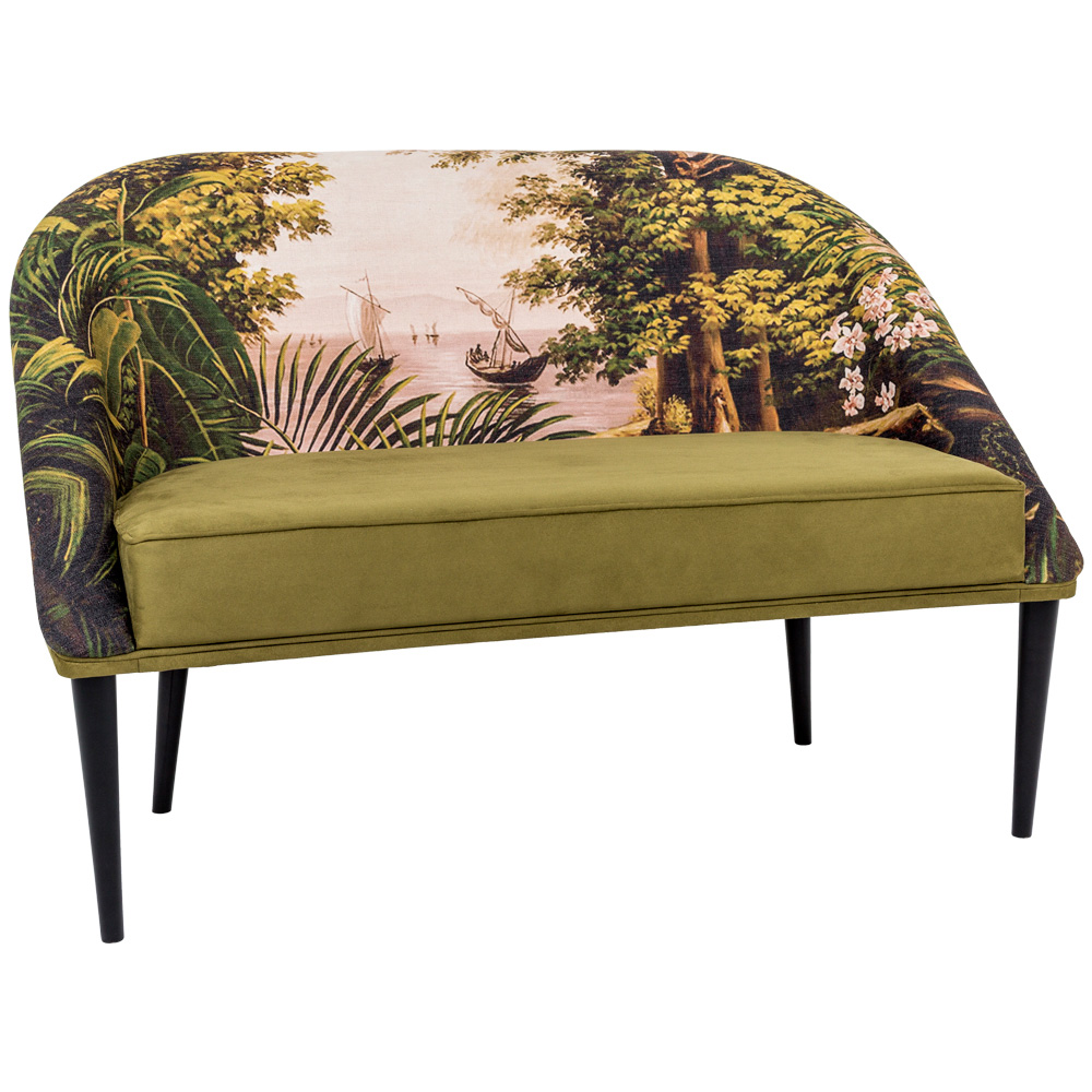 Дизайнерский диван «Сан-Кристобаль» демонстрирует заманчивые сочетания романтики и практичности, живописи и минимализма, уюта и респектабельности. Его бытовое применение не менее универсально: размер и формы благоприятны гостиной и кабинету, спальне и детской комнате, студии и холлу. Сочный зеленый цвет сиденья невероятно уютен в переливах бархатистой ткани, имитирующей уютную мягкую замшу. Логически приветствуя яркий природный рисунок, зеленая обивка обещает удачное соседство с разнообразным интерьерным фоном. Спинка Вашего дивана раскрашена великолепным тропическим пейзажем города Сан-Кристобаль, ставшего меккой международного туризма, сраженного невероятной природной красотой гор, пещер и заливов этого мексиканского города.