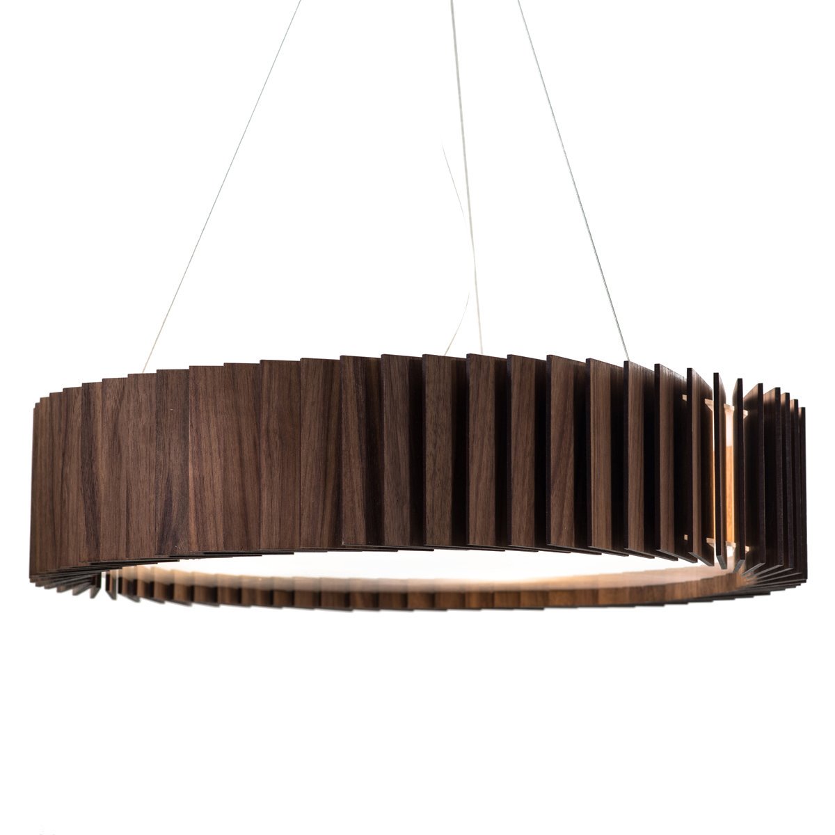 Люстра Ротор шпон ореха D55. Стильная люстра имеет динамичную форму и отлично подойдёт для современного интерьера. Основание Ротора изготовлено из акрилового матового стекла, и за счет рассеянного света люстра прекрасно осветит всё помещение. Деревянные пластины выполнены из шпона ореха и покрыты защитным маслом и воском, которые проявляют текстуру дерева.