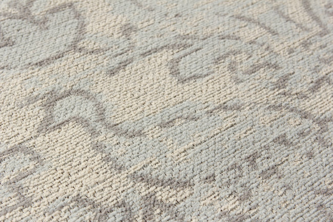 Синель, использованная в изготовлении данной модели ковра, — это новый пушистый вид ткани, полученный в результате сшивания нескольких слоев ткани параллельными строчками на швейной машинке и последующего разрезания верхних слоев между строчек. Хотя эту технику хорошо использовать в шитье одежды, она не менее практична, красива и функциональна в ковроткачестве.