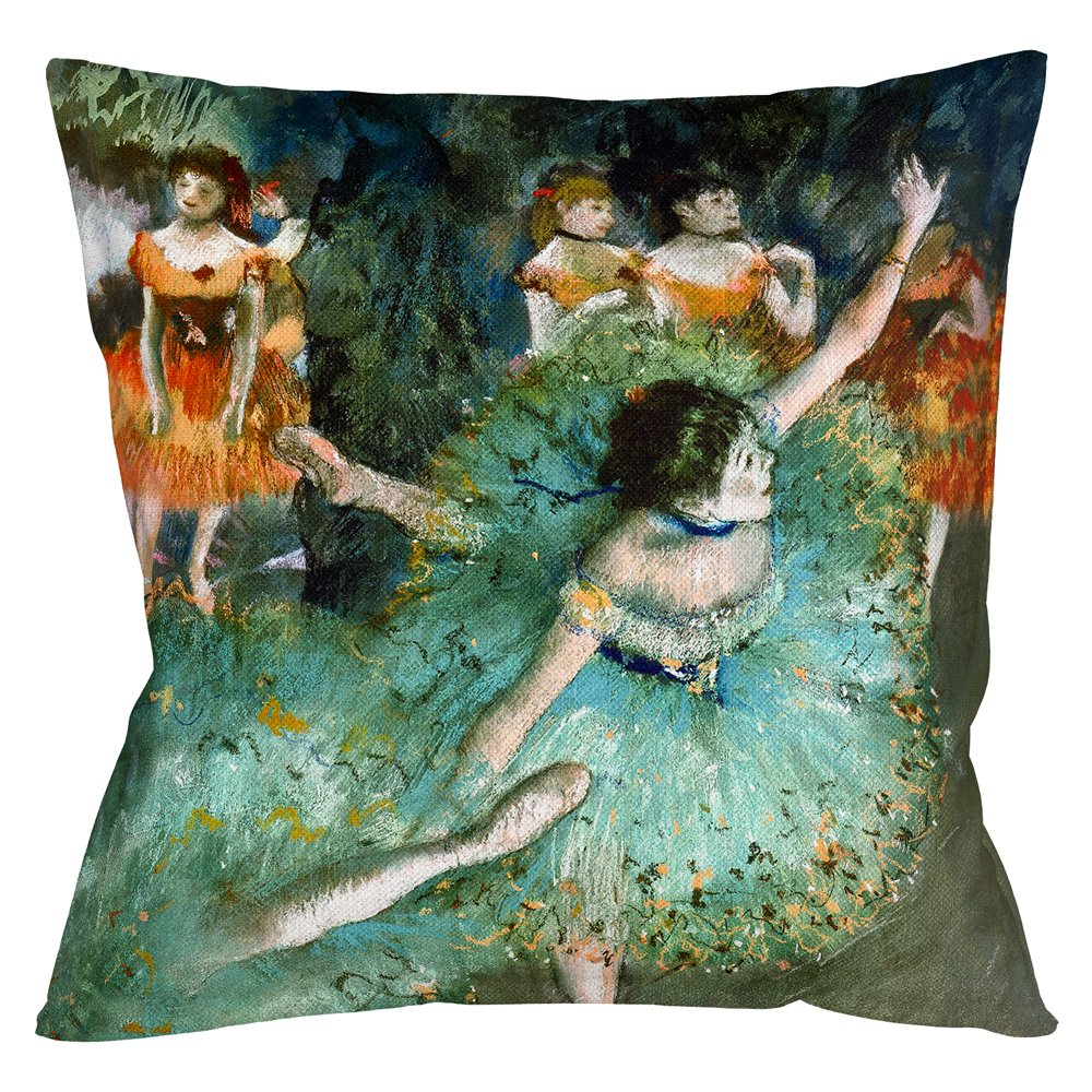 Превратить собственный интерьер в событие Вам помогут неожиданные экстравагантные образы и яркие краски импрессионизма, оживляющие обстановку энергичным настроением и интригующим сюжетом. К тому же, дизайн цитирует мировую классику живописи, престиж которой польстит любому, даже самому изысканному интерьеру. Подушка великолепно передает бархатистую фактуру пастельных красок, непревзойденным мастером которых является Эдгар Дега. Пастель привлекала мастера благородством, чистотой и свежестью цвета, трепетной вибрацией штриха, живостью и прозрачностью. Все эти достоинства живо иллюстрирует картина «Балерины в зеленом», созданная в 1879 году.
