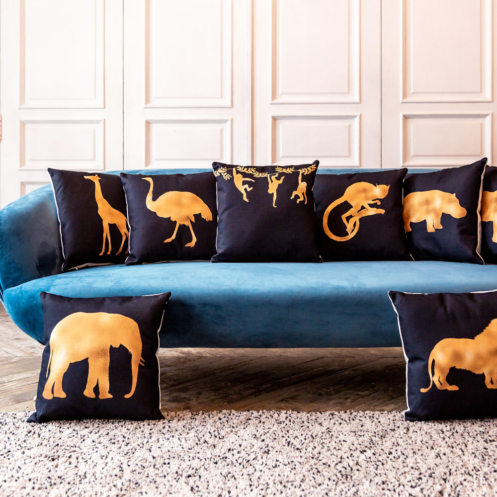 Носороги, жирафы и даже обезьянки не только сошлись характерами с нашими домами, но и прочно осели на диванах, креслах и кроватях. Всему виной – явный тренд на пятнисто-полосатые принты, не только в одежде, но и в дизайне интерьеров. На подушках фигуры животных нанесены краской, имитирующей золото. Игра различных оттенков желтого и бежевого цветов создает иллюзию блестящего покрытия.